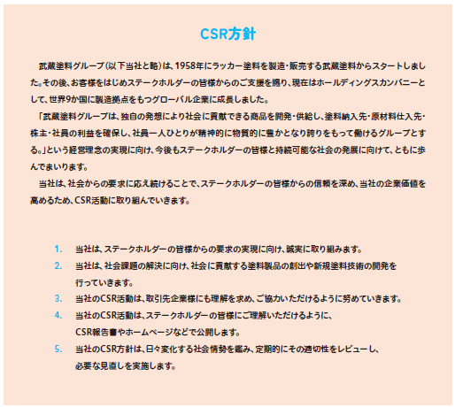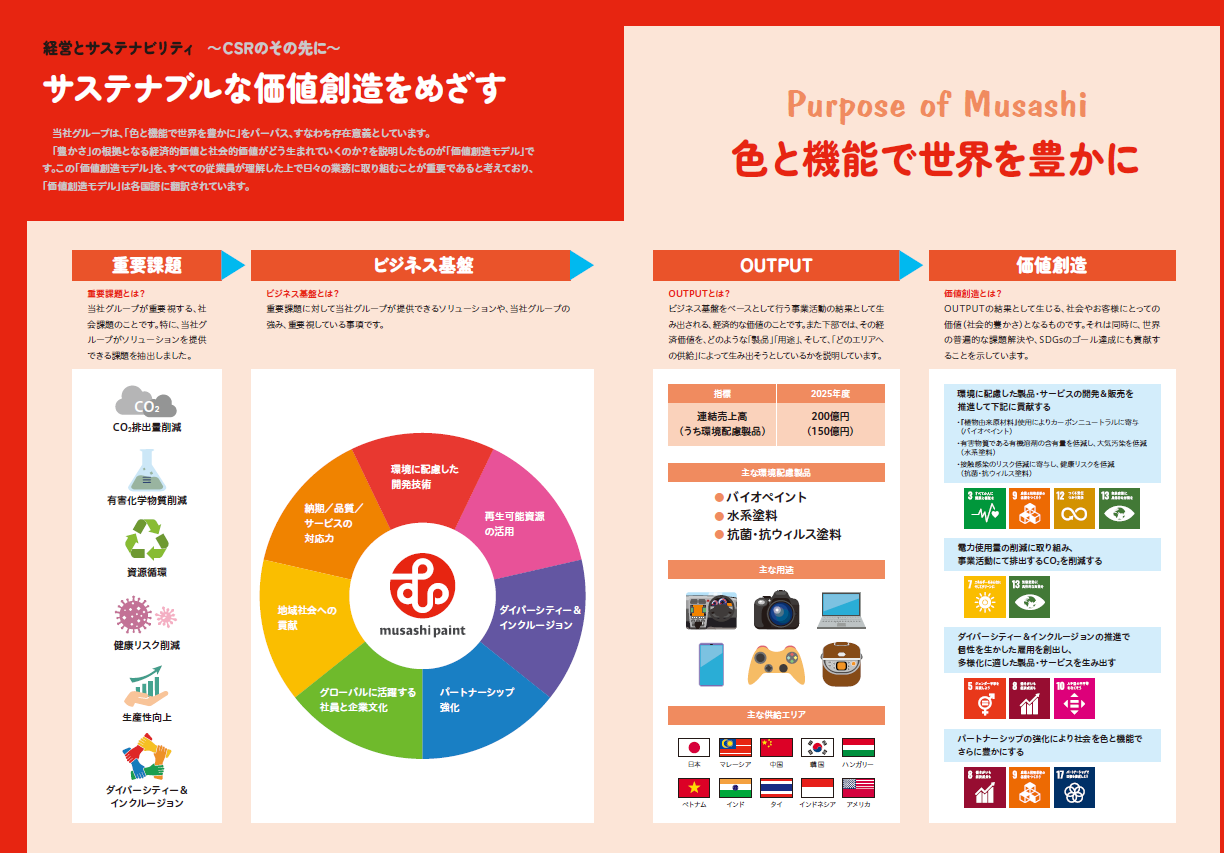 そして「世界を豊かに」は、複雑多様な社会課題に立ち向かうことで実現するのだと最近強く感じます。私たちは武蔵塗料らしい自社の持つ能力・強みを発揮し、社会課題の解決に貢献し、長期的な企業価値向上をめざします。