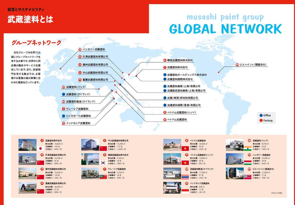 現在、武蔵塗料グループは、アジア、ヨーロッパ、アメリカの11カ国にネットワークを展開していますが、今後もできうる限り各地域に拠点を作り、雇用の創出や地域の活性化に貢献したいと考えています。