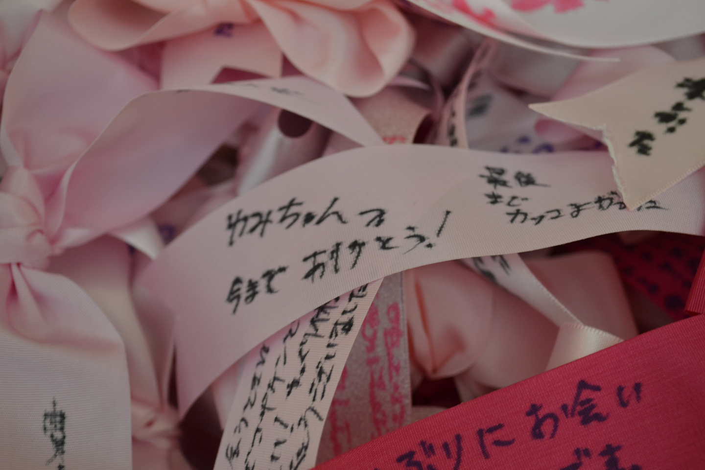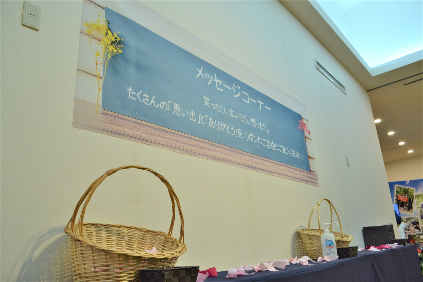 テーマカラーの「ピンク」リボンを準備し、メッセージをしたためてもらいました。