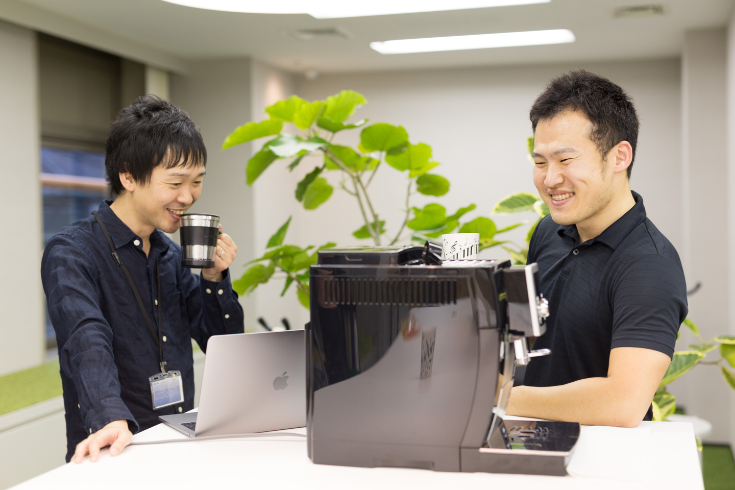 わが社の宝物、デロンギのそばで休憩をとる渡邊さん(写真左)。