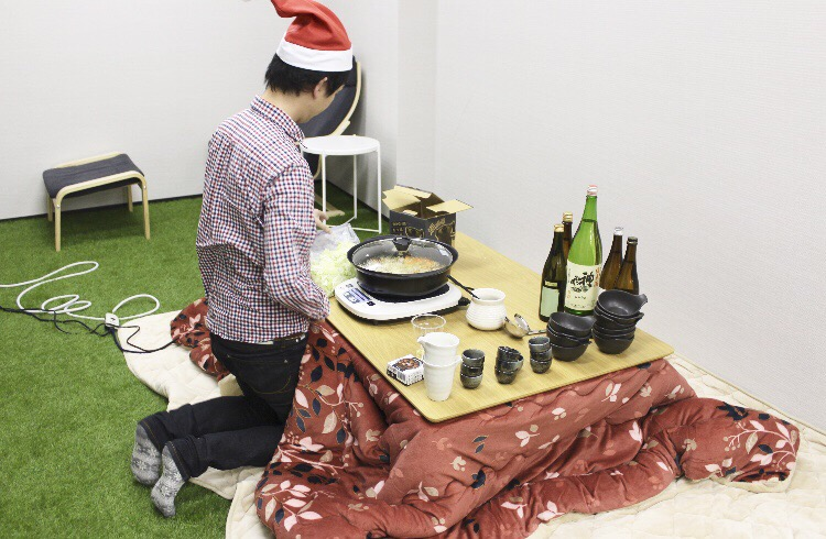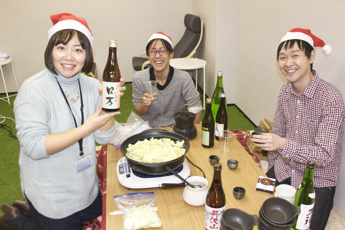 忘年会で社員さんたちに囲まれる渡邊さん(写真右)。タイトルとは裏腹に人気者ですね…。