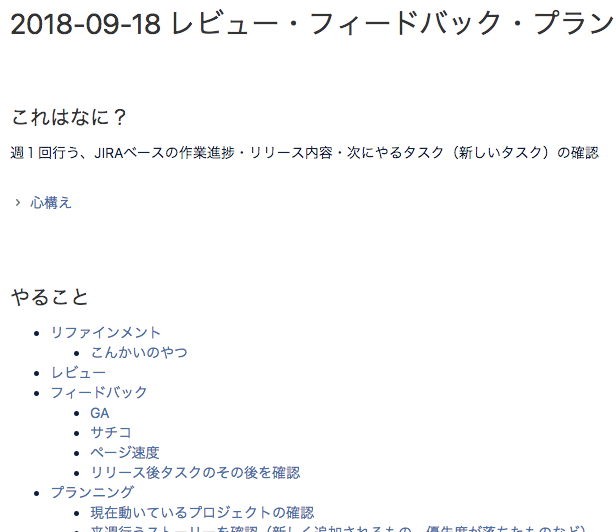 毎週月曜日に週次定例として、リファインメント・レビュー・フィードバック・プランニングを行なっています。ここでやっていることは、前週と今週の開発とサービスに関する諸々の共有と意思決定になります。