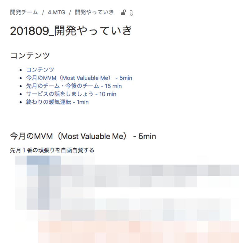 実際のアジェンダ。社内の情報共有はConfluenceを利用していて、議事録はチームで輪番で作成してます。