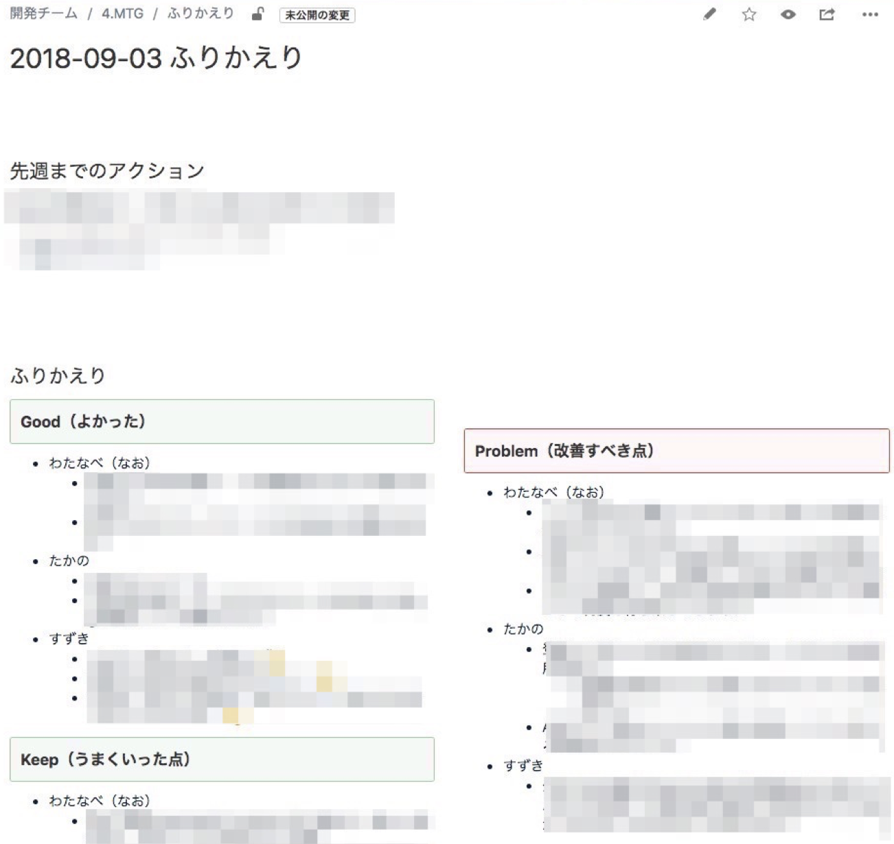 ふりかえりのフォーマットは、KPT + G(Good:自分も含むメンバーへの賞賛)を利用しています。ここでは、それぞれがKeep/Problemを話して、そこで出たProblemを元に、Tryを議論したりして、次のアクションにつなげたりします。(ちなみに、以前の記事で紹介させていただいたアウトプットランチなる制度はここから登場しました)
