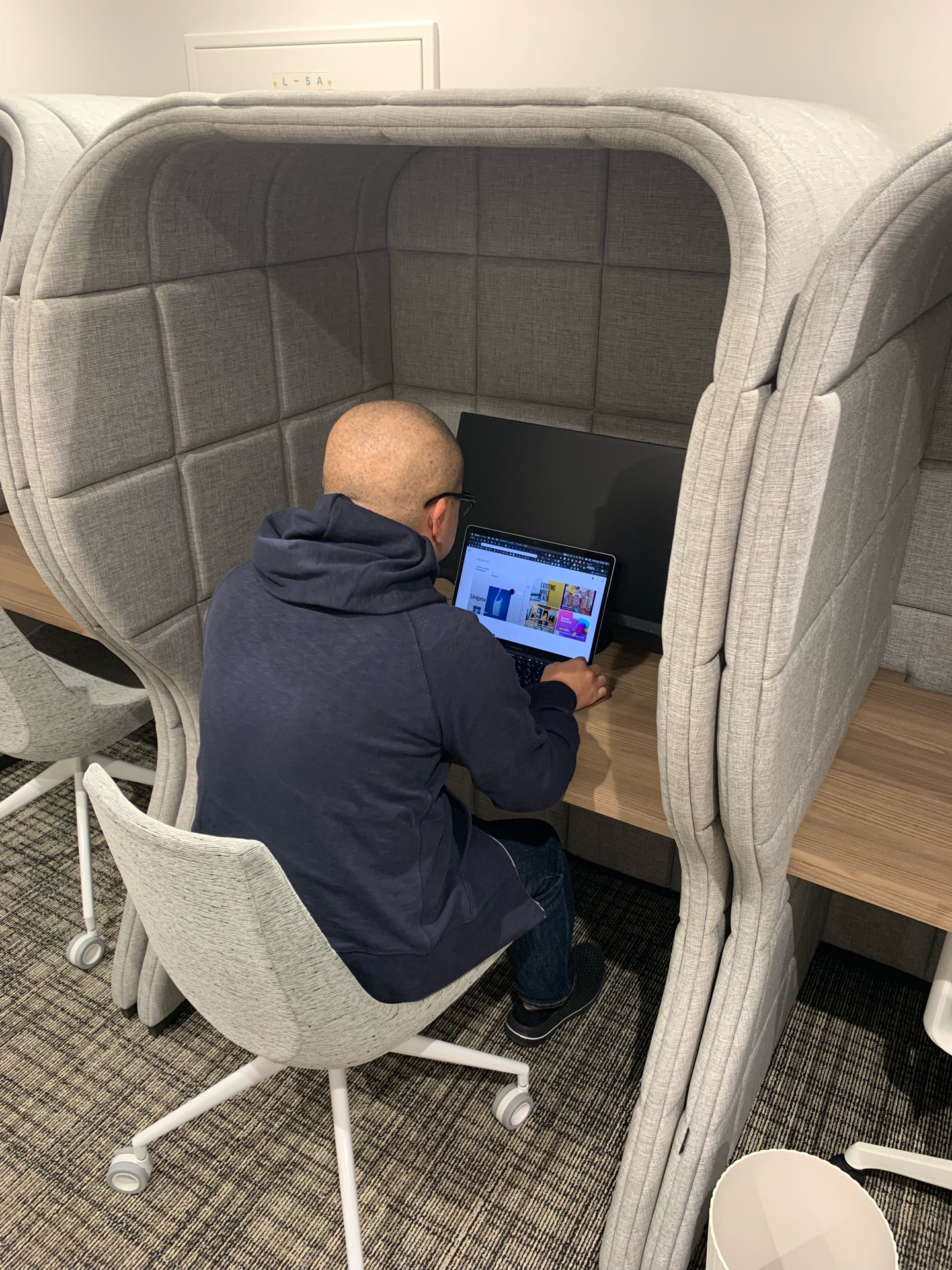 上のような集中ボックス(中に頭を入れると周りの音が聞こえづらくなる)が複数連なっているスペースがあります。写真だと暗いですが、ボックスの上に電気が付いており開発も問題なく行えます