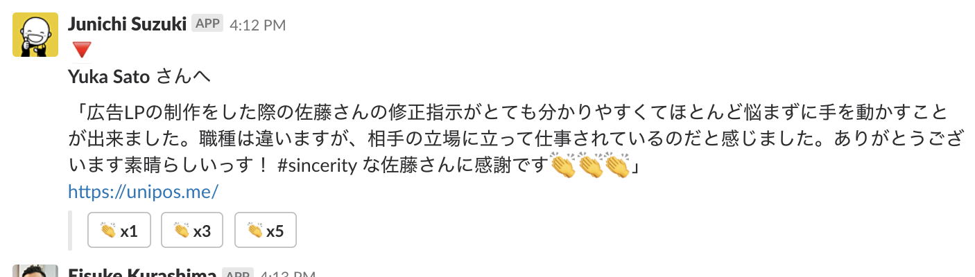 Uniposの例。こんな感じで、バリューに沿ったタグをつけたりして職種関係なく送りあったりしています。月末にはバリューに沿った行動をしている方を表彰したりもします。