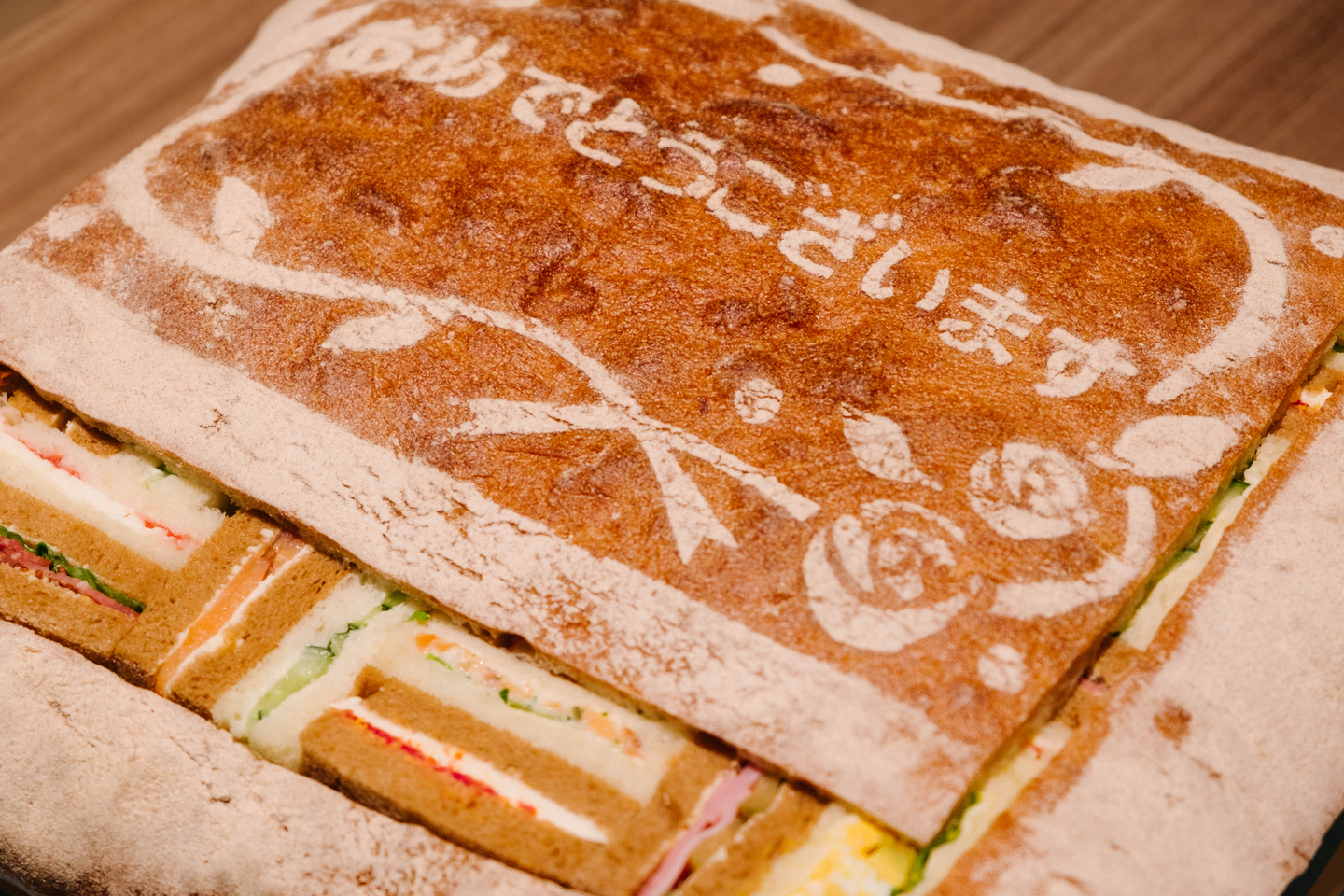 外部の方々からお土産をいただきました!大きなハード系パンに「おめでとうございます」とお祝いのメッセージを書いてくださっていて、フタを開けると、なんとサンドイッチが♡