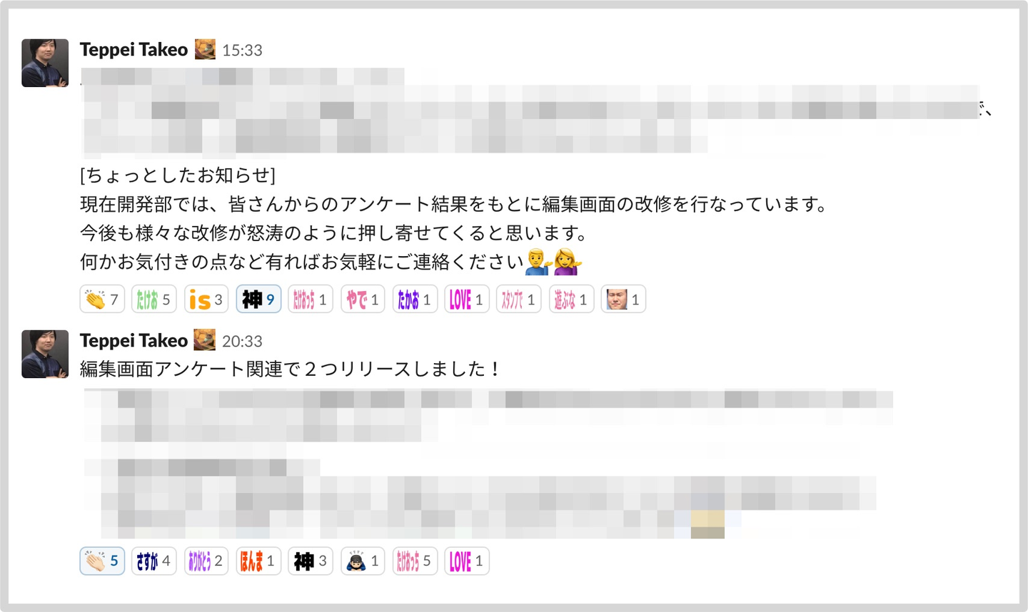 やっぱり社内の共有slackでリリース報告したときに、メンバーからスタンプがいっぱいきてると達成感がありますね。