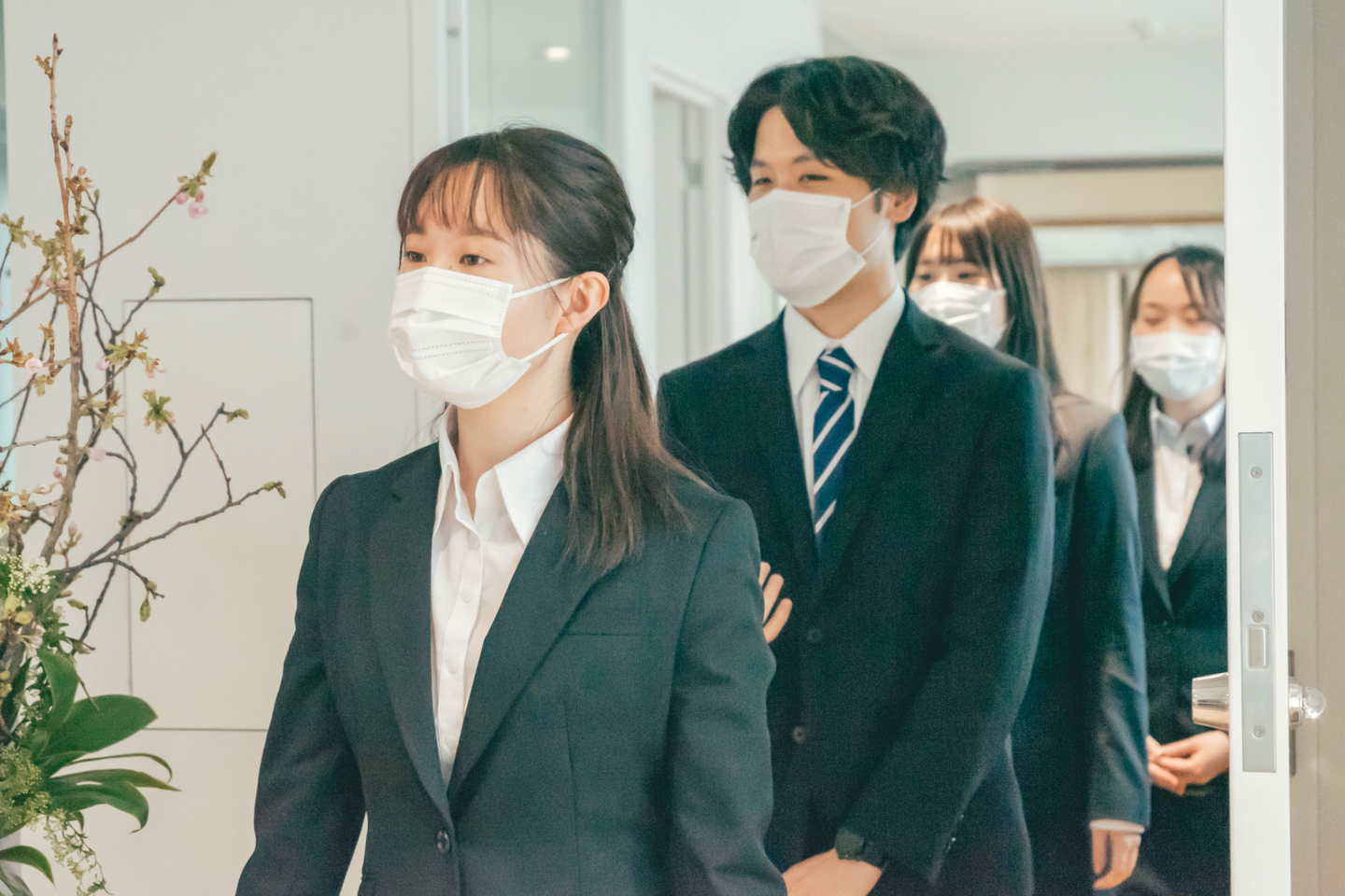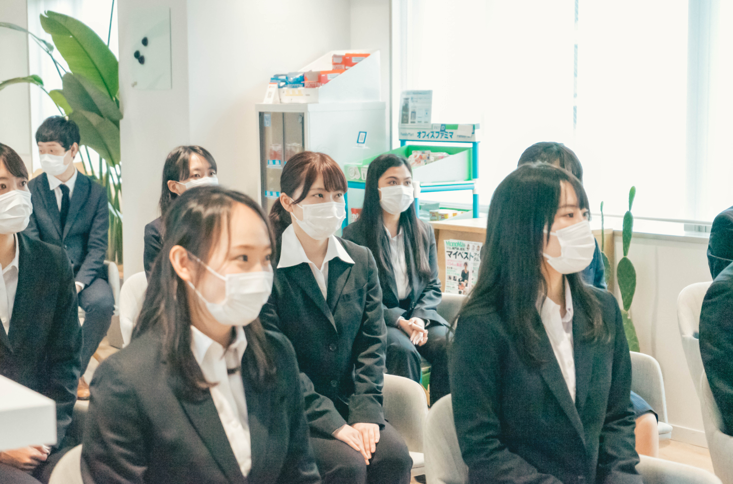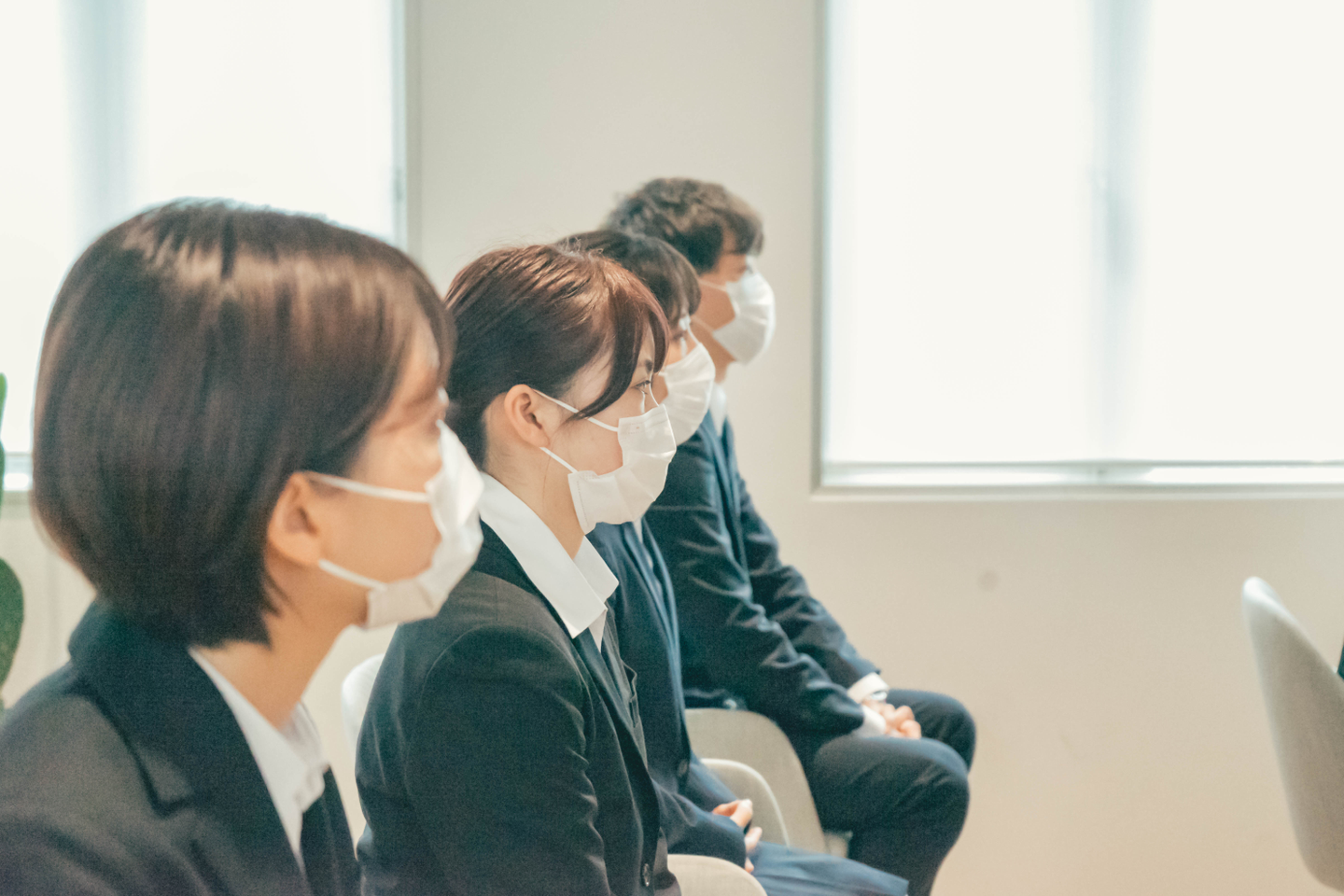 マイベスト初の入社式は、新型コロナウイルスの対策として参加者全員のマスク着用という形で開催しました。20卒メンバーにとって人生で一度きりとなる入社式だからこそ、感染リスクを出来るだけ低くして開催しようという会社側の想いによるもの。