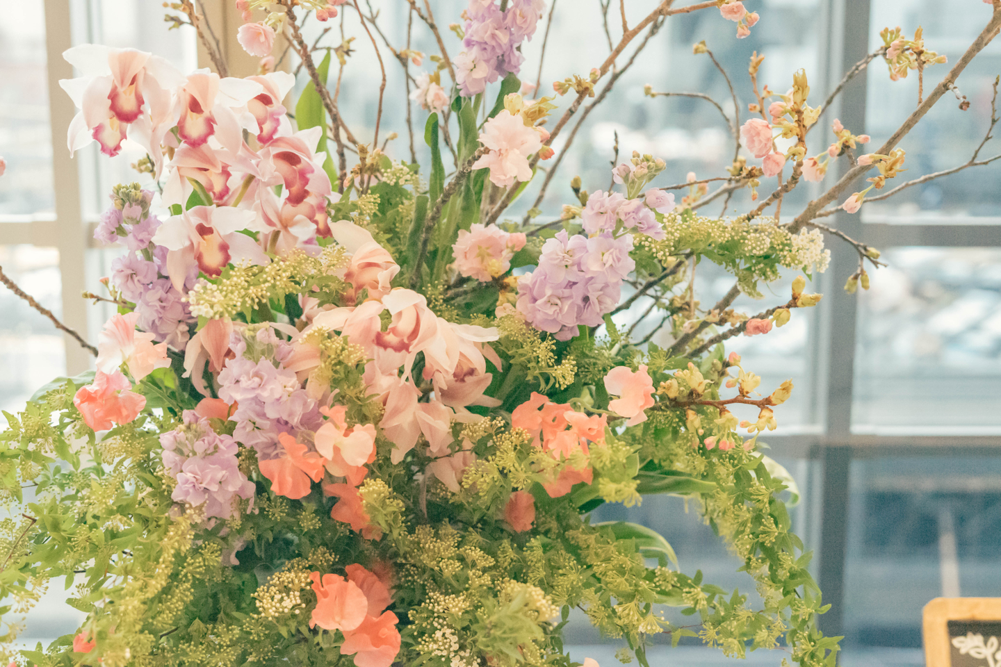 今回入社式に用意したスタンド花は、春らしさをイメージして桜が入ったものを選びました。