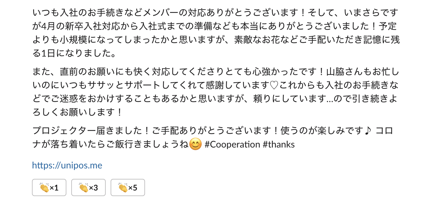 ユニポスでのやりとりはポジティブな発言や言葉が多く使われているので、贈った人・贈られた人だけでなく、そのポストを見た人もハッピーになるといいなと思っています。良い言葉は人に良い影響を与えると信じています!