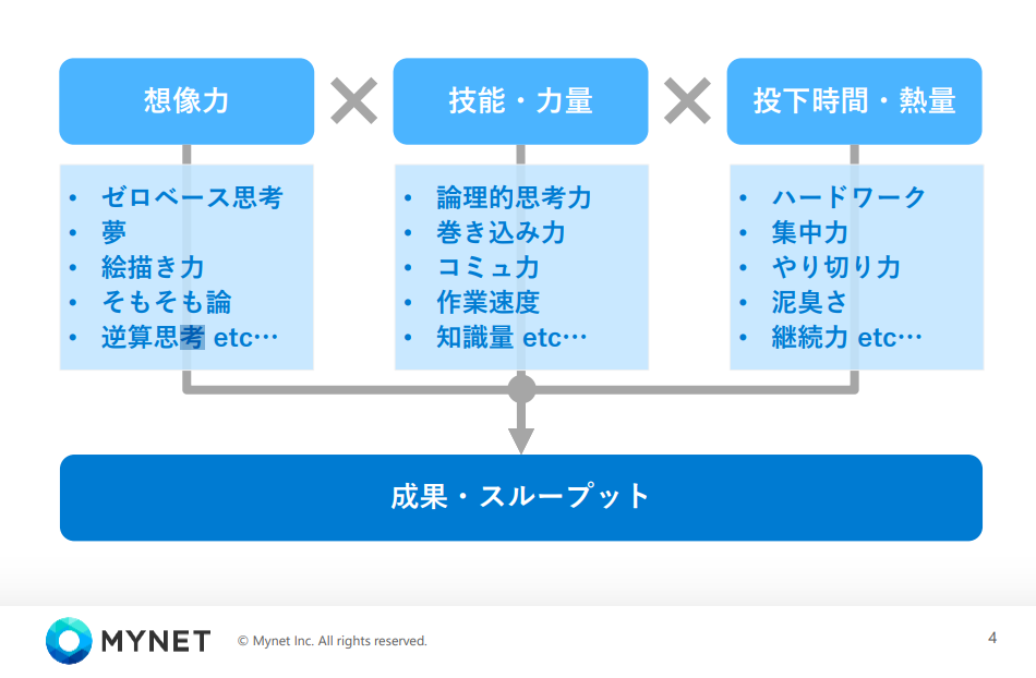 成果は想像力、技能・力量、投下時間・熱量がかけ合わさって生み出されます。技能・力量はあるに越したことはないけれど、ある程度経験で身につけられます。