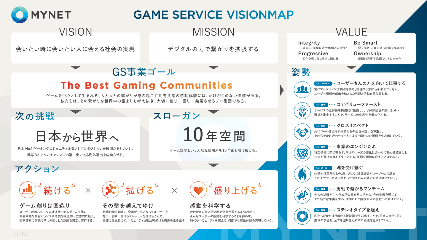 まず、ゲームサービス事業が会社と一体となって成長していくために、マイネットとして掲げるビジョン・ミッション・バリューとの関連は保つようにしています。最終的にはゲームサービス事業のアクションや目標が、企業としてのフィロソフィーに繋がることを前提に作成を始めました。
