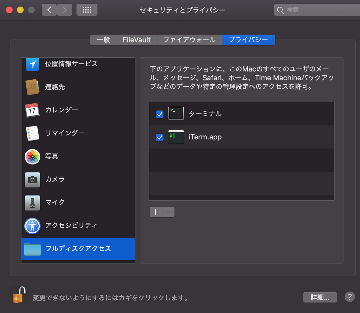 システム環境設定 > セキュリティとプライバシー > フルディスクアクセス にiTerm2 とターミナルを追加した。