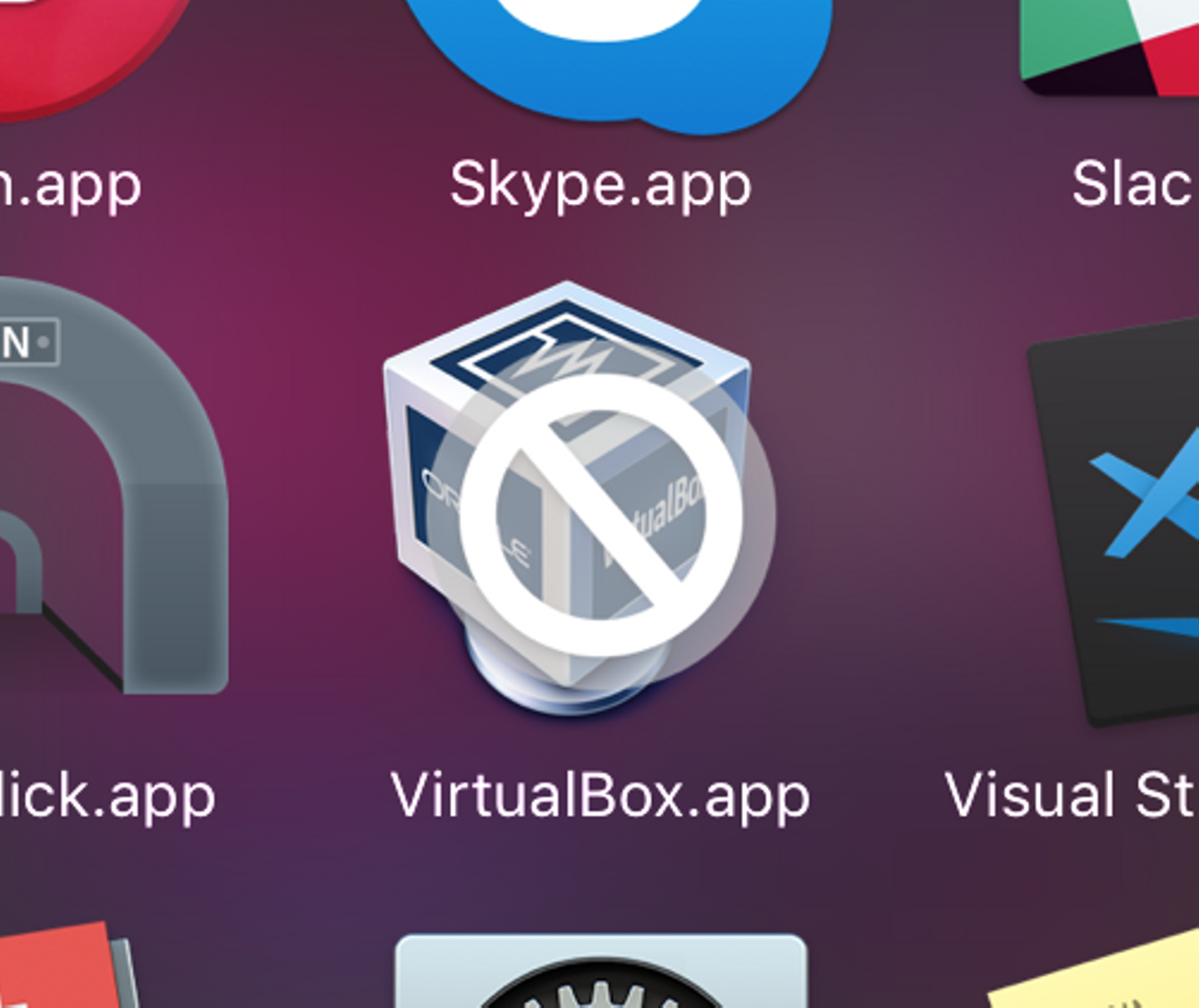 アプリケーションを覗いたら、案の定 VirtualBox が使用不可になっていた。