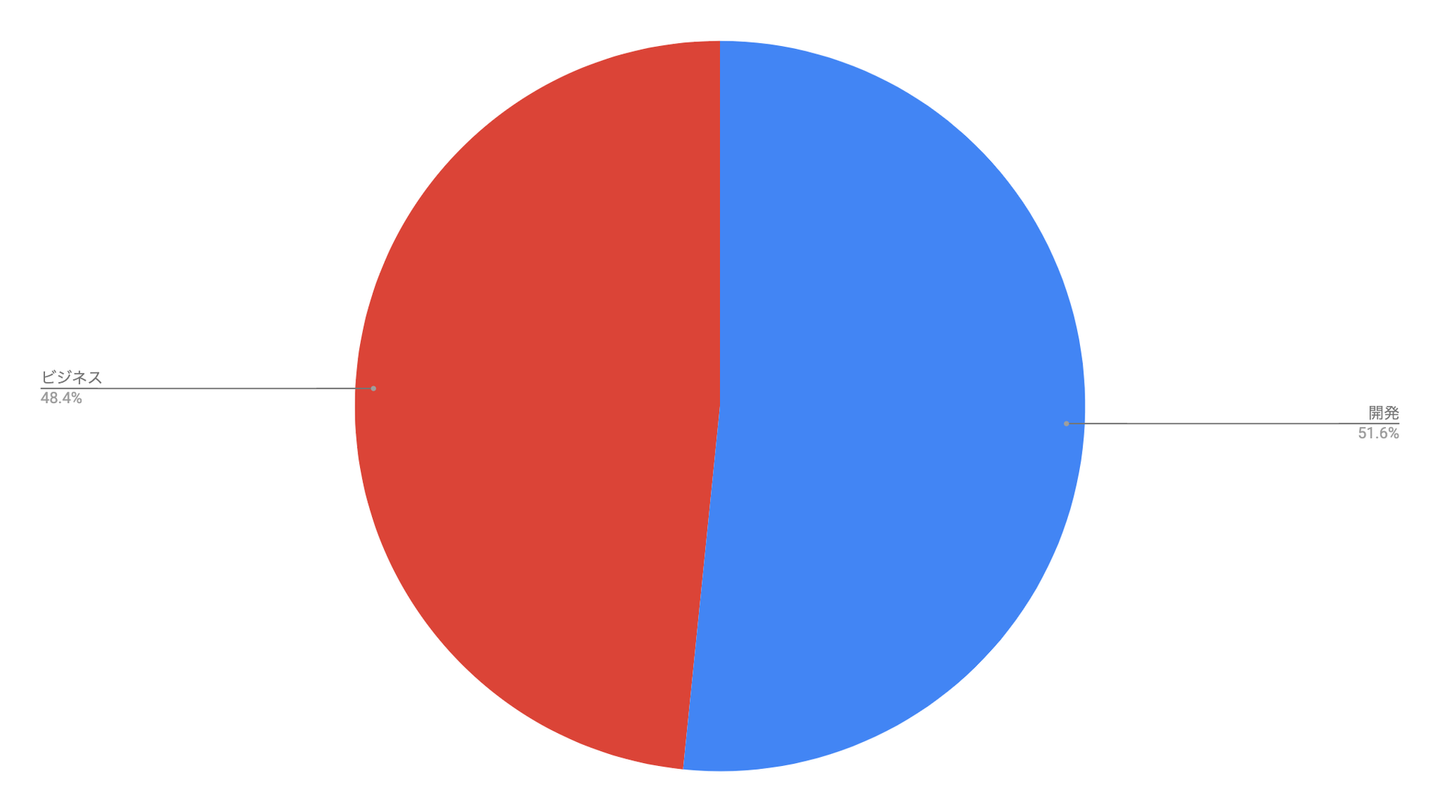 ●職種別には、次年度に向けてセールスチームを増強したので、エンジニアとビジネスチームの割合が概ね半々になりました。2021年は開発中の新サービスをガンガン売っていきますので、よろしくお願いします!