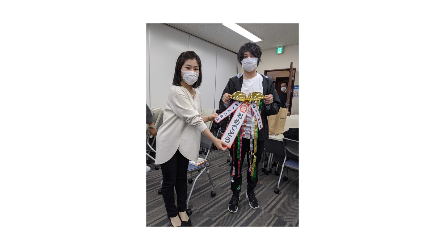 アルバイトから社員となった2名。5月の全員研修時にくす玉を割ってお祝いしました。