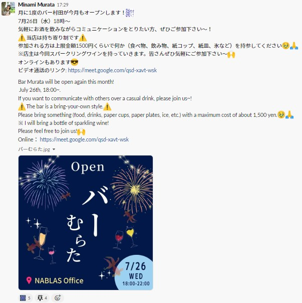 ▲リモートワークでのコミュニケーション手段として様々な懇親会を開催。これはPR部門の村田さんがママを務める「バーむらた」のお知らせ