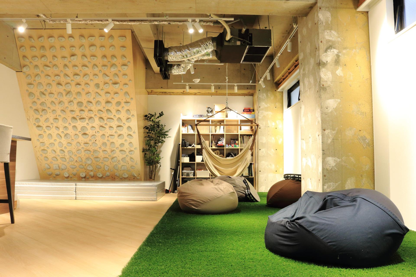 ▲オフィスには、ボルダリングのできる壁やハンモック、芝生などを完備したスペースも。デザインを手がけたのは代表の中山