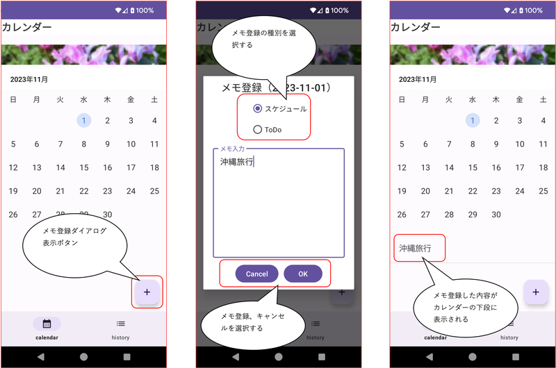 classSimpleDialogFragment():DialogFragment(){ private lateinit varviewModel: DialogViewModel override fun onCreate(savedInstanceState: Bundle?){ super.onCreate(savedInstanceState) //ViewModelProviderの第一引数にrequireActivityを指定してあげると // Fragmentを使っているActivityでも同じViewModelのインスタンスをシェアできる。 viewModel =ViewModelProvider(requireActivity(), DialogViewModel.DialogViewModelFactory( (activity?.application as CalendarAppApplication).scheduleRepositoryRoom, )).get(DialogViewModel::class.java) } override fun onCreateView( inflater: LayoutInflater, container: ViewGroup?, savedInstanceState: Bundle? ): View?{ val v = inflater.inflate(R.layout.fragment_simple_dialog, container,false) purchaseButton.setOnClickListener { //スケジュール登録を行う。 viewModel.insertScheduleData(memoEditText.text.toString(), date, type) observePurchaseState() } cancelButton.setOnClickListener { viewModel.state.value = DialogState.Cancel(this@SimpleDialogFragment) dismissAllowingStateLoss() } return v } override fun onCancel(dialog: DialogInterface){ super.onCancel(dialog) viewModel.state.value = DialogState.Cancel(this@SimpleDialogFragment) } /**