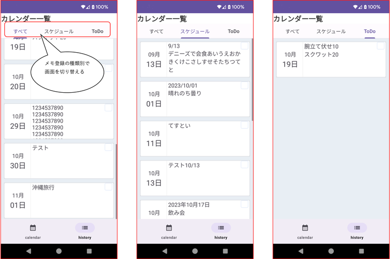 classScheduleRepositoryRoom( private val scheduleDao: ScheduleDao, ){ //メモ一覧を取得する suspend fun selectScheduleList(): List<Schedule>{ return scheduleDao.selectScheduleList() } //メモの種類を指定しメモ一覧を取得する suspend fun selectScheduleListByOrder(type: Int): List<Schedule>{ return scheduleDao.selectScheduleListByOrder(type) } //メモの種類を指定しメモ一覧を取得する suspend fun selectScheduleListByOrderAsc(type: Int): List<Schedule>{ return scheduleDao.selectScheduleListByOrderAsc(type) } //日付に紐づくメモ一覧を取得する suspend fun selectScheduleListOnDate(targetDate: Date): List<Schedule>{ return scheduleDao.selectScheduleListOnDate(targetDate) } //登録したメモを追加する suspend fun insertResult(data: Schedule): Long{ return scheduleDao.insertResult(data) } } classScheduleRepositoryRoom( private val scheduleDao: ScheduleDao, ){ //メモ一覧を取得する suspend fun selectScheduleList(): List<Schedule>{ return scheduleDao.selectScheduleList() } //メモの種類を指定しメモ一覧を取得する suspend fun selectScheduleListByOrder(type: Int): List<Schedule>{ return scheduleDao.selectScheduleListByOrder(type) } //メモの種類を指定しメモ一覧を取得する suspend fun selectScheduleListByOrderAsc(type: Int): List<Schedule>{ return scheduleDao.selectScheduleListByOrderAsc(type) } //日付に紐づくメモ一覧を取得する suspend fun selectScheduleListOnDate(targetDate: Date): List<Schedule>{ return scheduleDao.selectScheduleListOnDate(targetDate) } //登録したメモを追加する suspend fun insertResult(data: Schedule): Long{ return scheduleDao.insertResult(data) } }