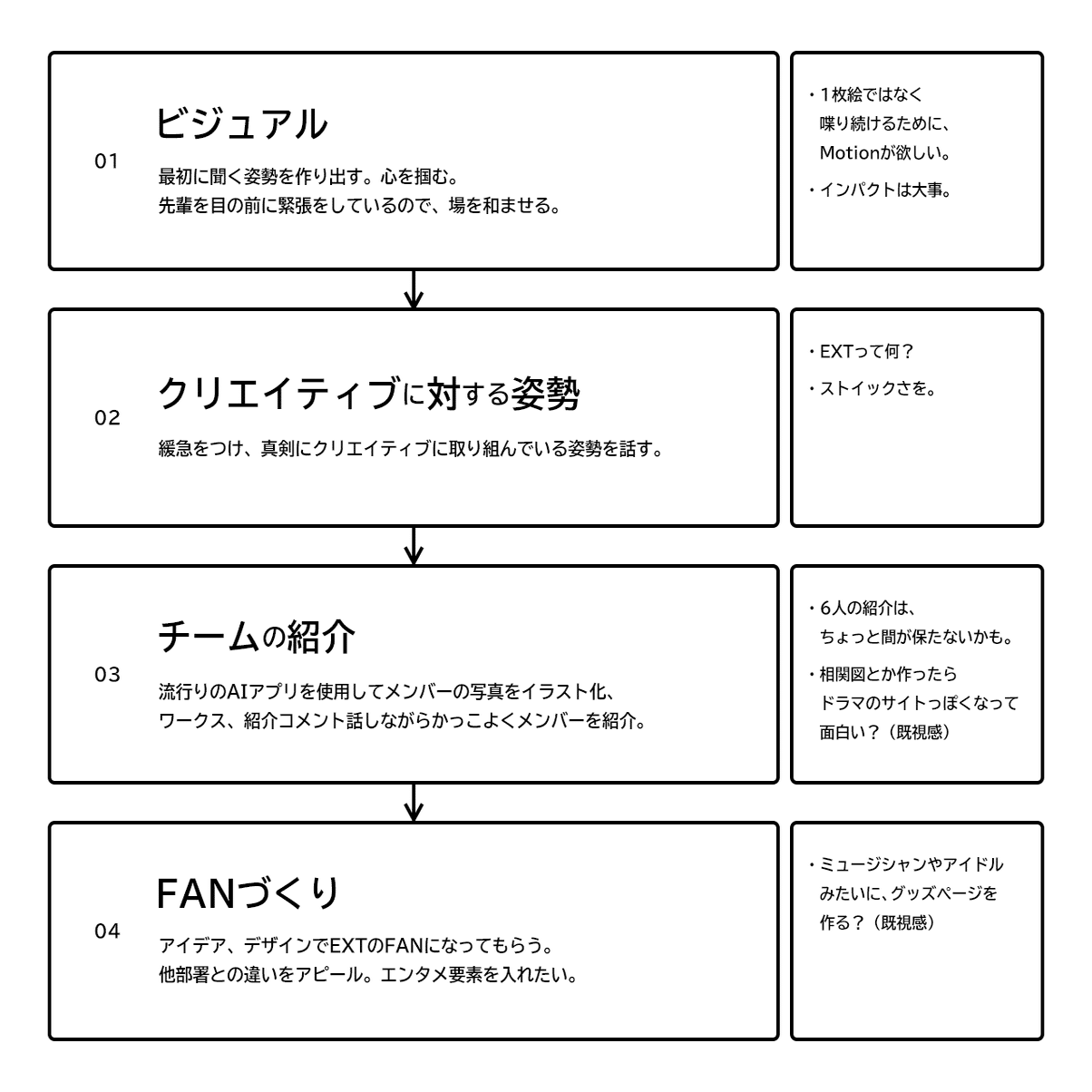 次にコンテンツの順番をまとめ、簡単に体験を想定し、課題を明確にします。