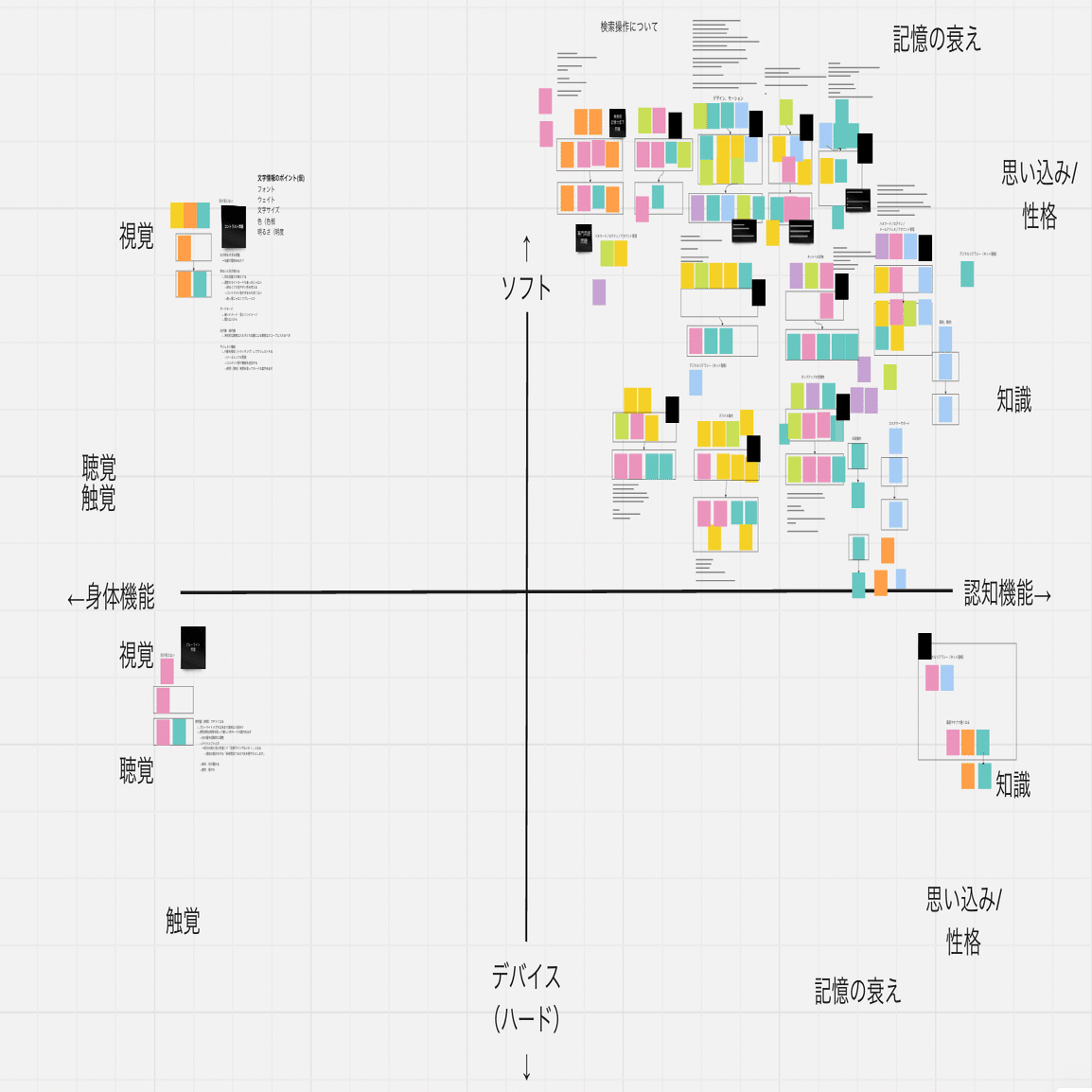 この分類を行うことで、ナディアにおけるシニアUI/UXプロジェクトが解決すべき領域が明確になりました。そして、プロジェクトメンバーが持ち寄った課題と仮説をまとめ、今回開発すべき初期スコープの設定を行いました。