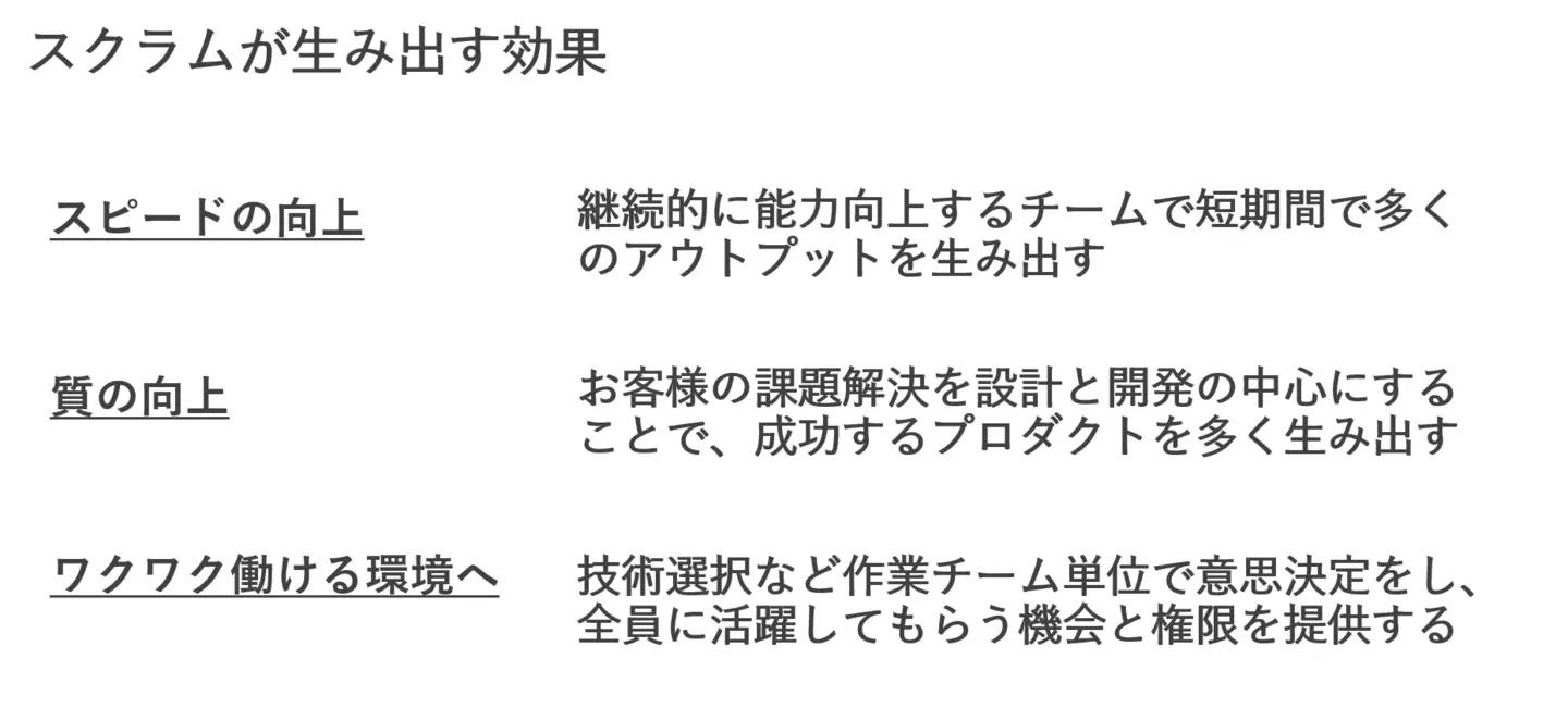 コアバリューを体現するための1つの手段としてナレコムではスクラムの考え方を取り入れています。私としてはスクラムは組織に与える効果とコアバリューがリンクすると考えています。