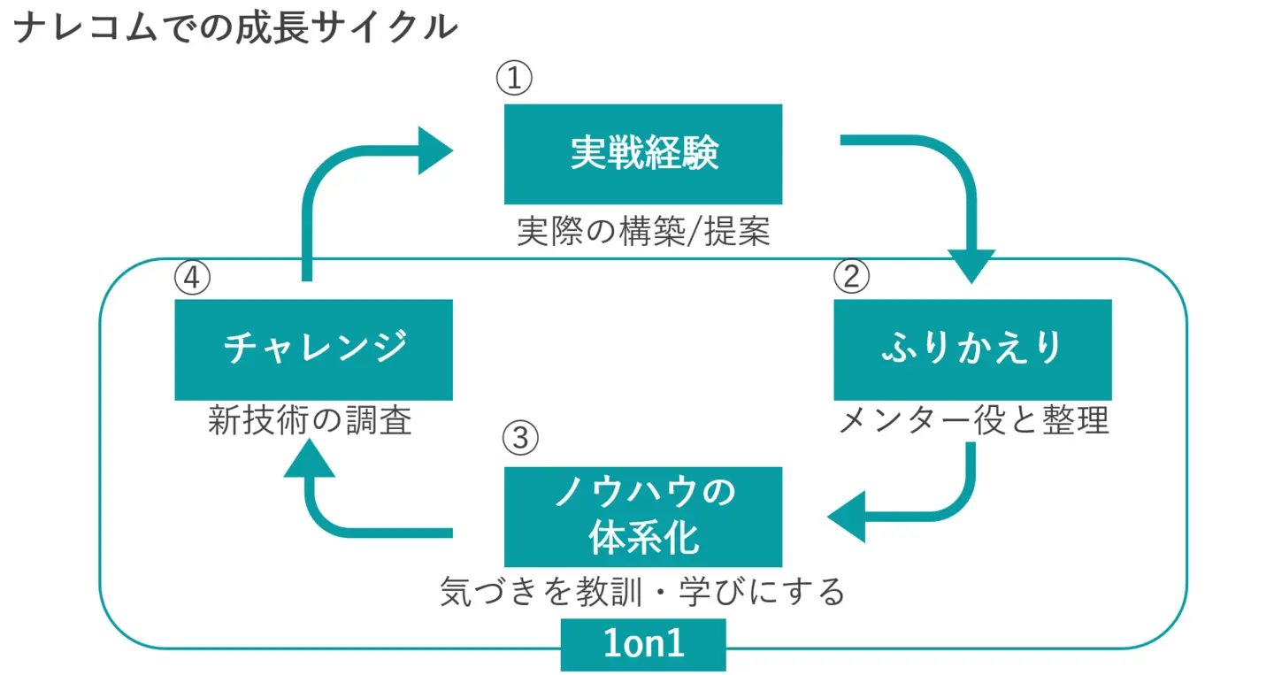 1on1 は業務のことだけではなく日々の課題や趣味の話などもしながら、ナレコムのチームの一員としていち早く活躍していくサポートの場と考えています。
