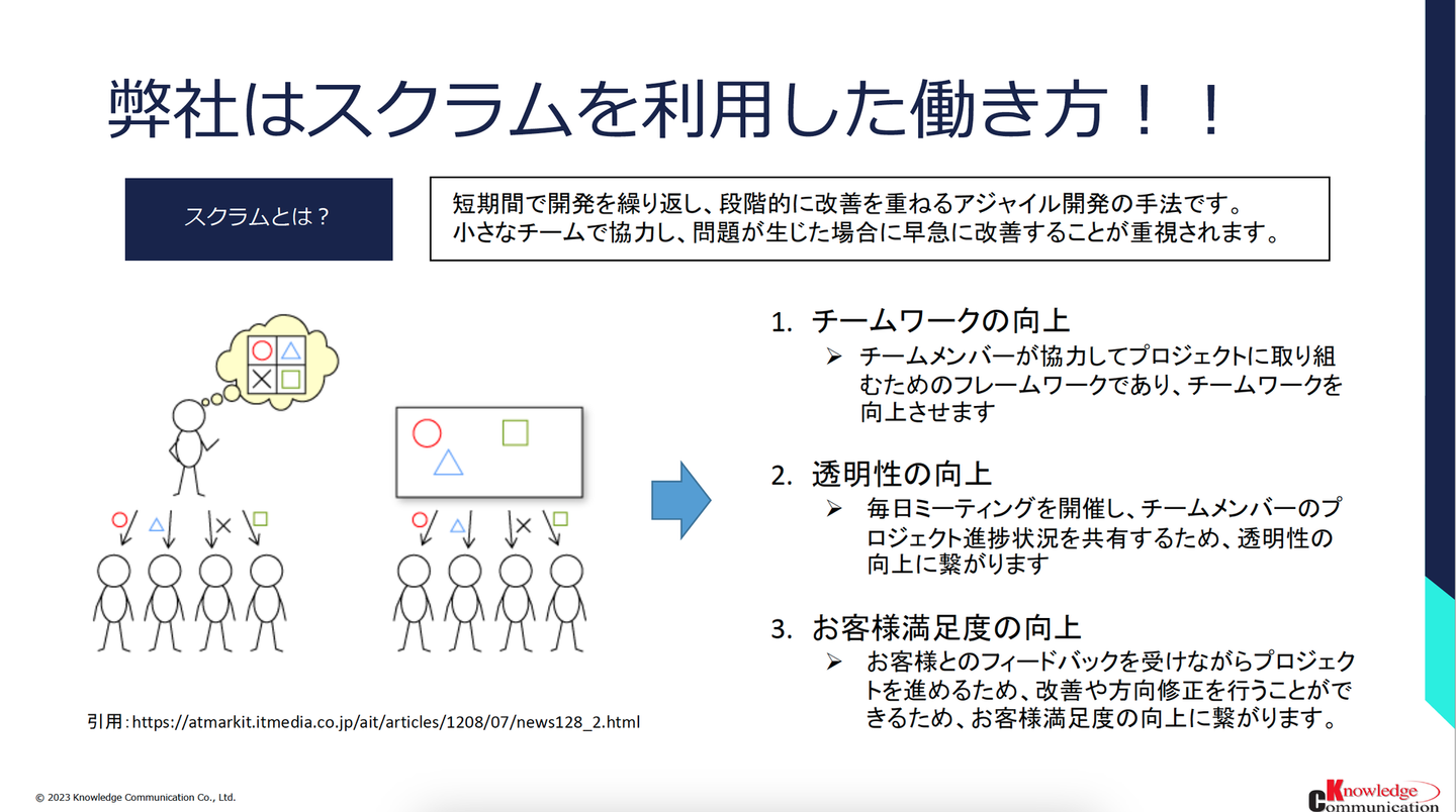現場では、小さなチームで協力し、課題は早急に改善するスクラムを利用しています。短期間で開発を繰り返し改善を重ね、チームワークの向上、透明性の向上、お客様満足度の向上に繋げていく、という働き方です。