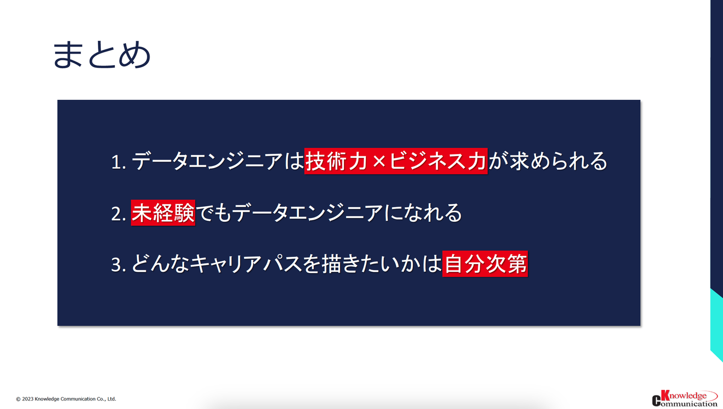 これからデータエンジニアを目指す方へ、何から始めたらいいのか、具体的な資格や勉強方法、ナレコムでの働き方についてご説明しました。