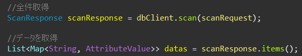 そしてscanメソッドを使用して全件スキャンを実行し、ScanResponseからスキャン結果のアイテムリストを取得します。
