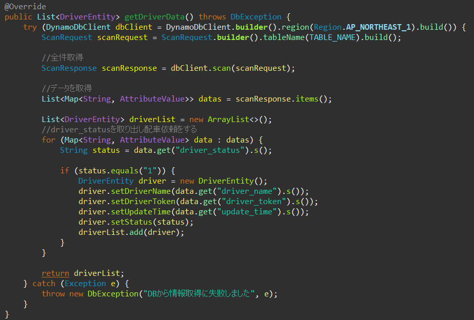 ※今回のケースではテーブルサイズが非常に小さく、全件取得が必要であったためscanを使用しました。ただしテーブルサイズが大きくなると負荷が増大するため、Queryを使用することを推奨します。