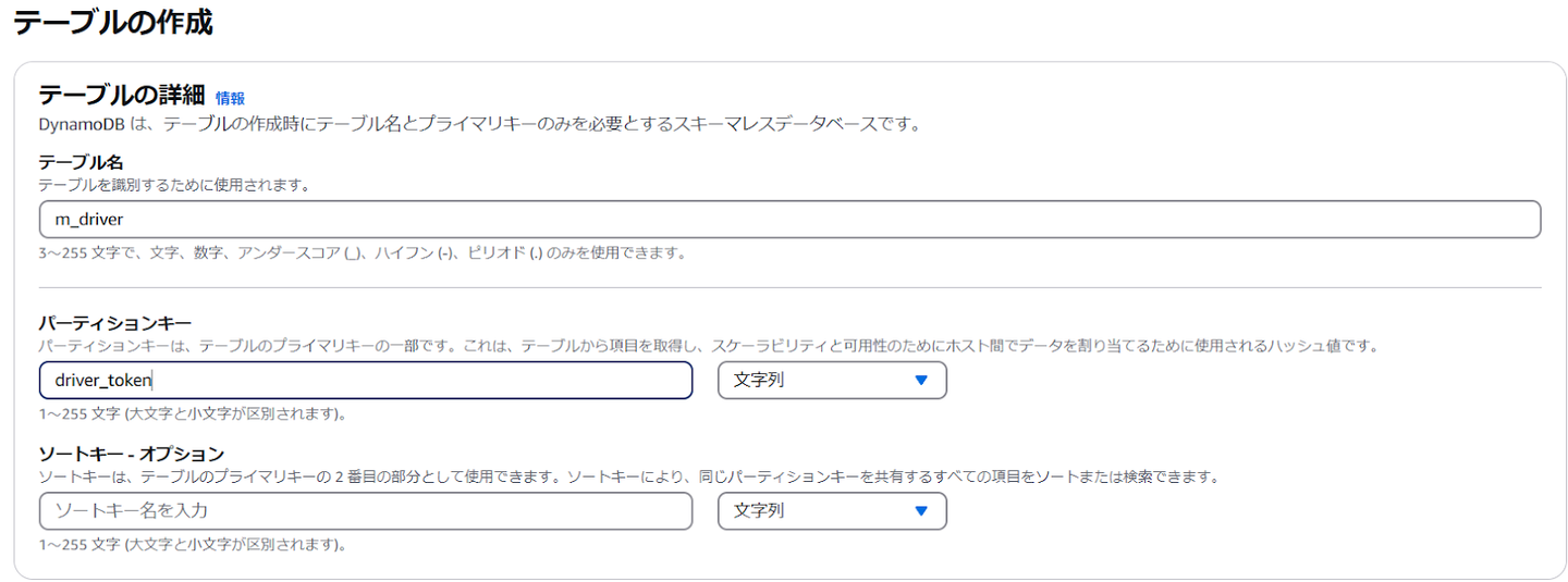 AWSコンソール画面にログインして、サービスからDynamoDBを選択します。その後「テーブル」ページへ移動し「テーブルを作成」ボタンを押下してテーブル名やパーティションキーなど必要な項目を入力します。今回は下記のように入力しました。
