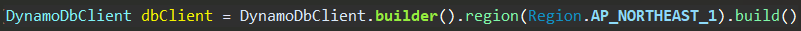 まずDynamoDBに接続するためのクライアントを作成します。使用するリージョンとして今回は「東京リージョン」を指定しています。