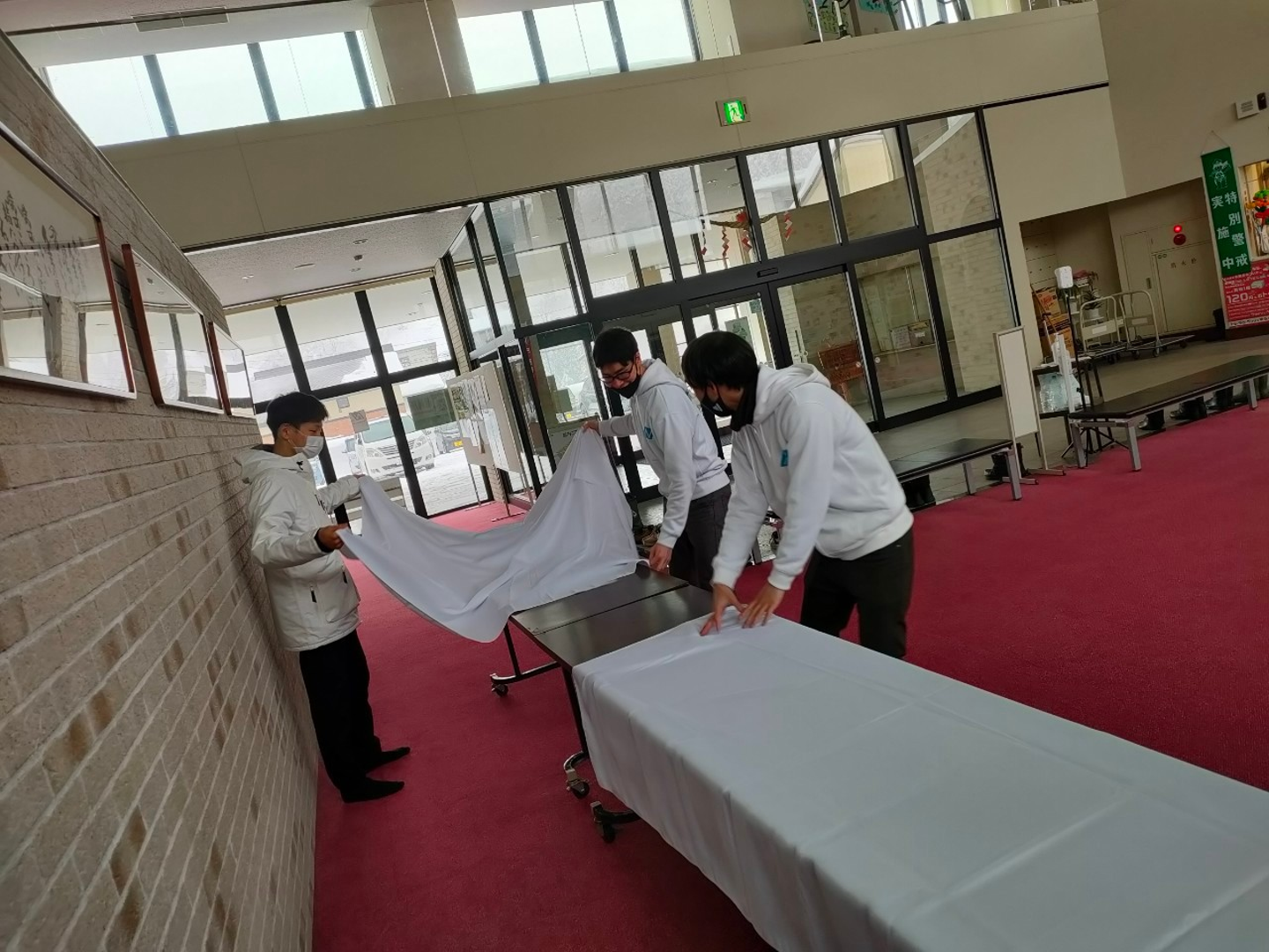 リハーサルでは実際に机を配置し、来場者がどのような流れでお越しいただくのかのシュミレーションをします。また、紙やペンの配置を確認し、本番に備えていました。