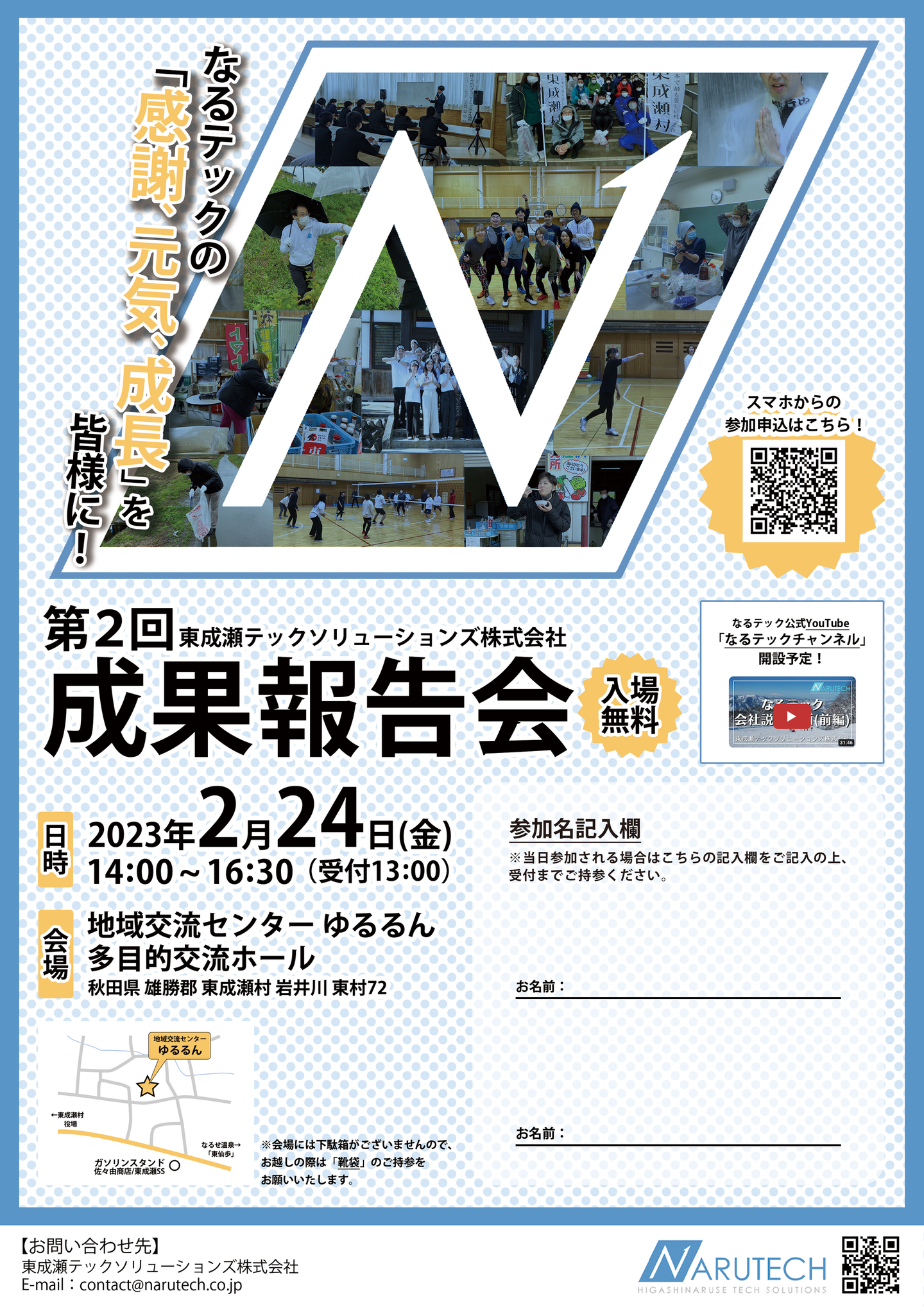 今回なるテックが成果報告会を開催しますが、その理由としては東成瀬村の方や関係者に向けて活動報告をするためです。