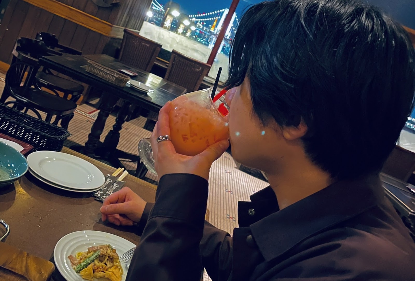 Barで食事とお酒をたしなむ小松侑末さん