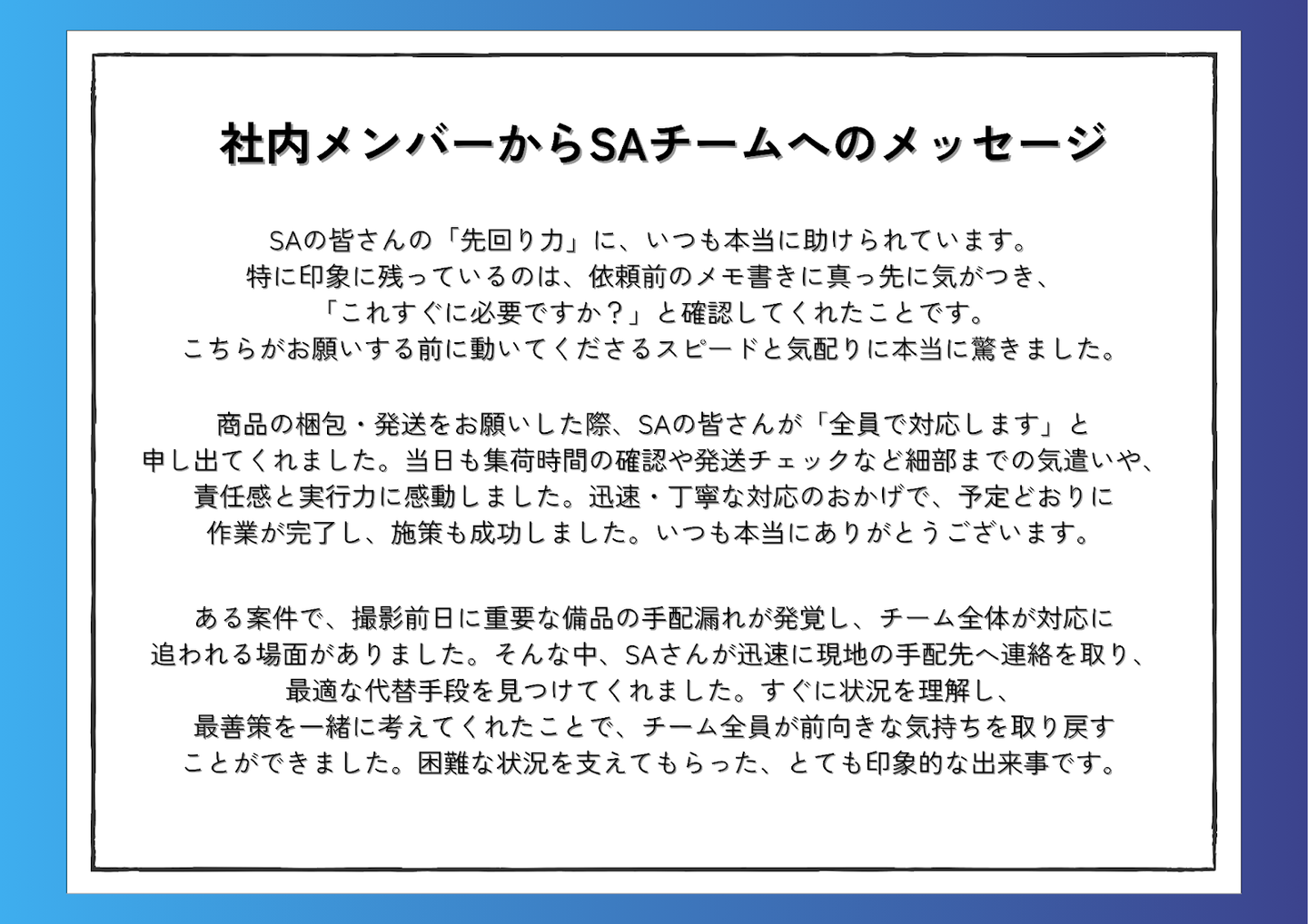 ━━SAチームのメンバー同士も、良い関係性で連携している印象があります。