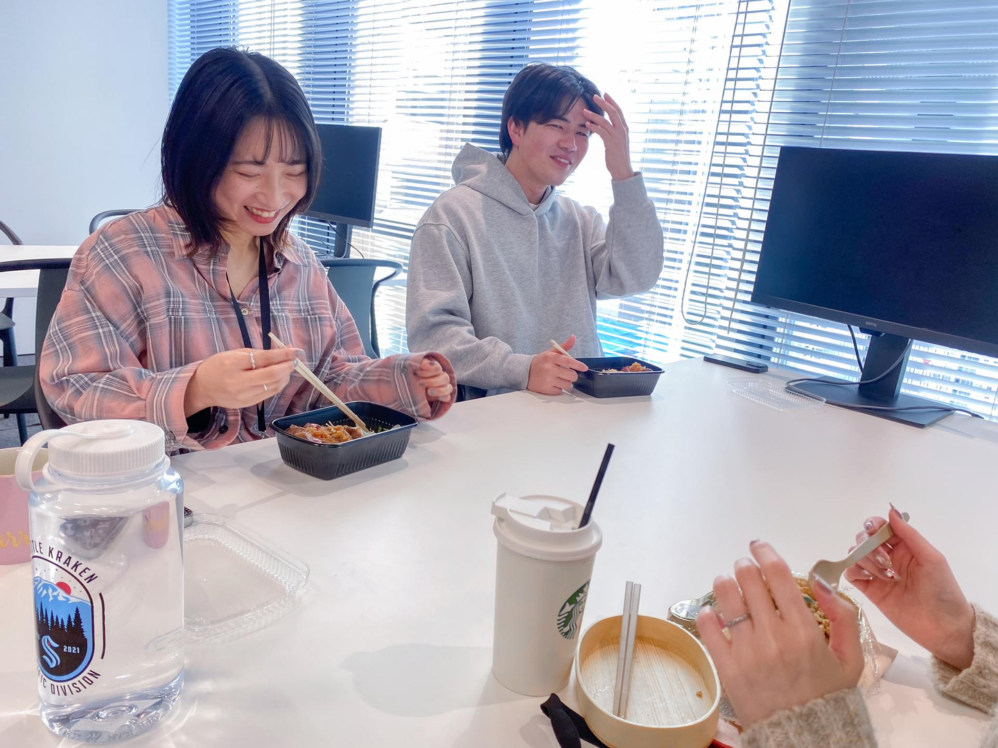 先輩社員と食事を買いに行き、社内のフリースペースで食べることが多いですね。仕事の話をすることもありますが、最近観たコンテンツやプライベートの話をすることも。