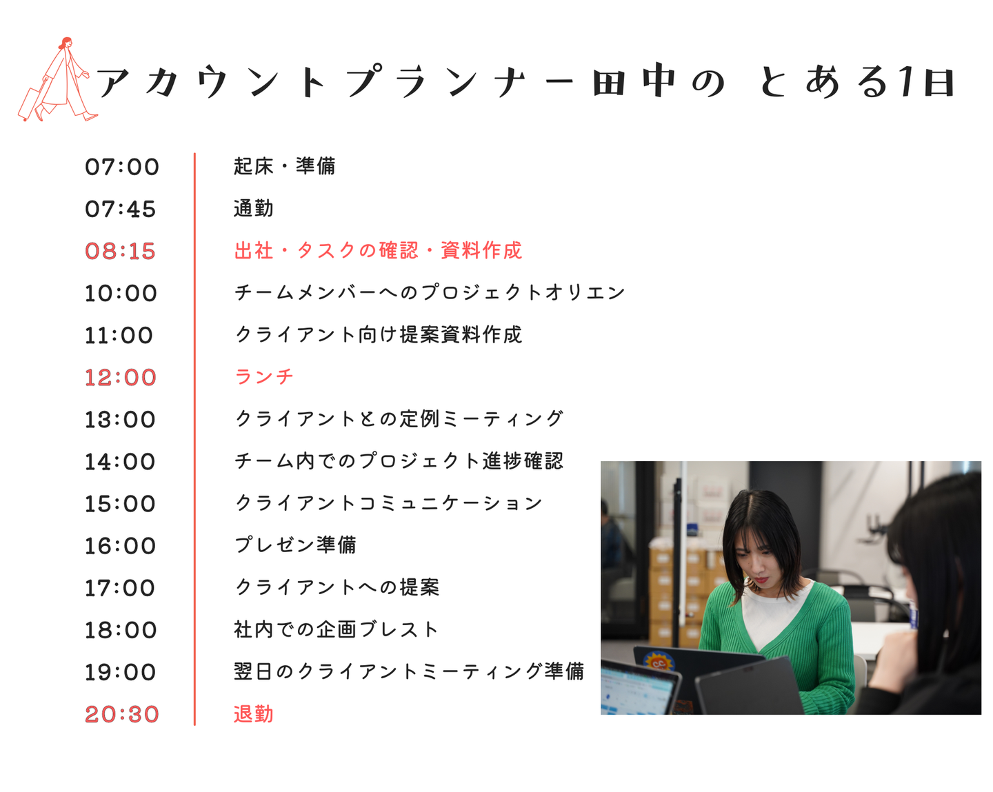 今回は、営業チームでアカウントプランナーとして活躍する田中に、1日のスケジュールと仕事内容についてのインタビューをしました。