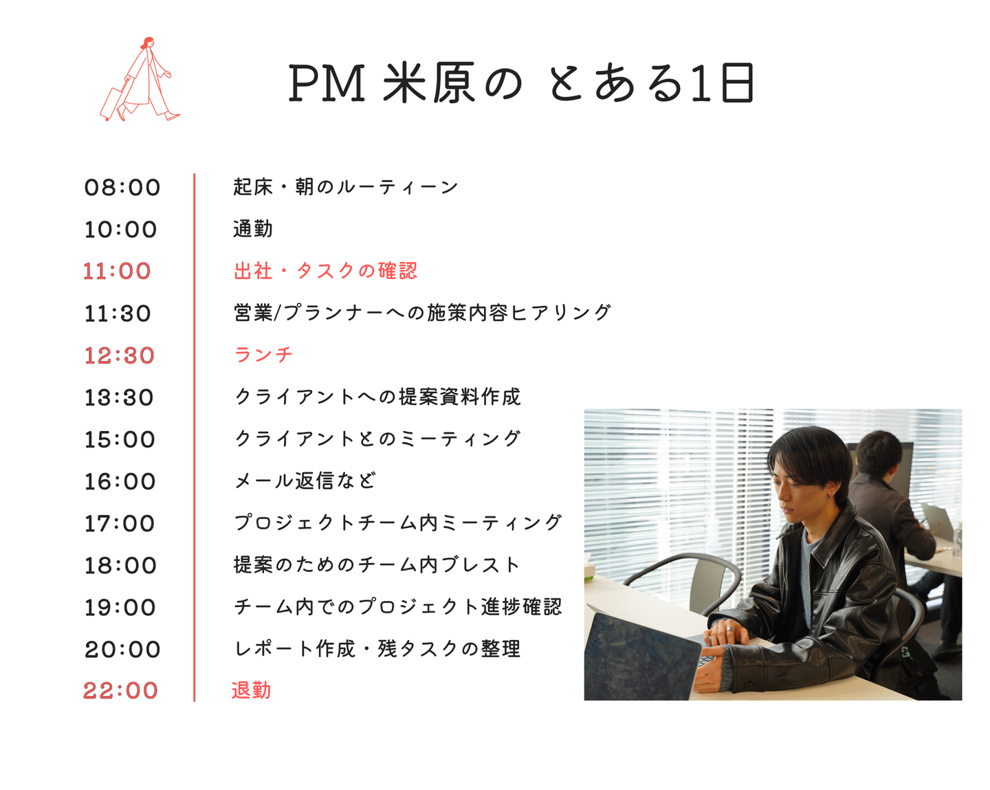 今回は、プロジェクトマネージャー(PM)として活躍する米原に、1日のスケジュールと仕事内容についてインタビューをしました。