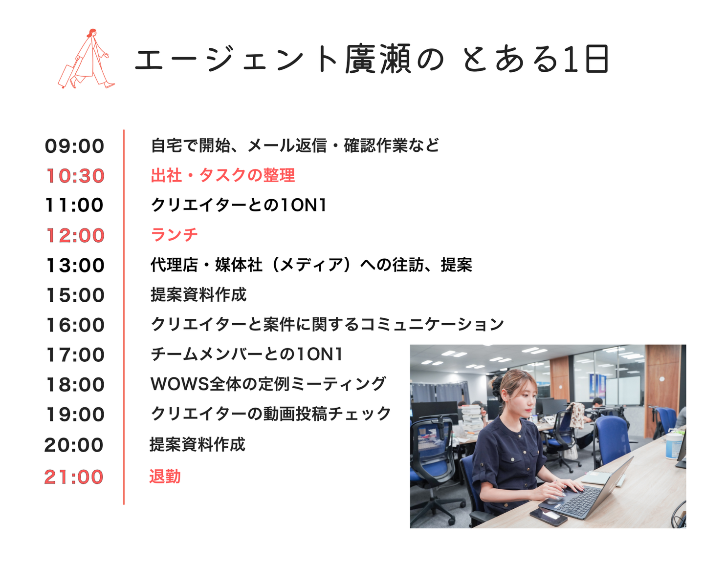 そんな廣瀬がエージェントとして大切にしていることとは?エージェント業務のとある1日について聞きながら、WOWsチームの魅力について取材しました。