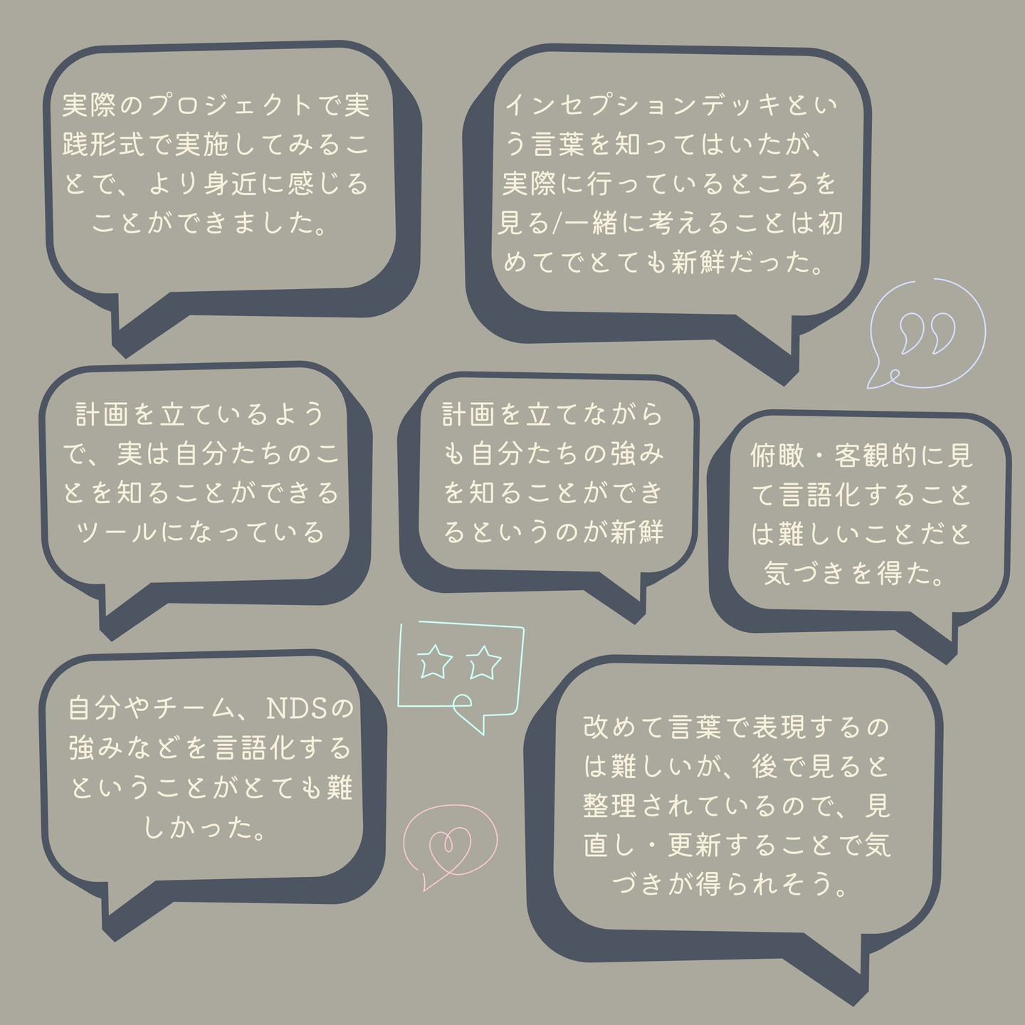 参加者から、インセプションデッキの活用のメリットを実感でき、