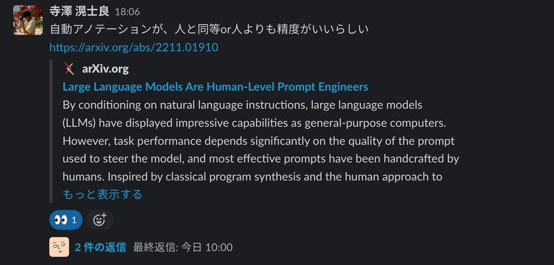 まずはslackで、生成AIに関して情報共有を行ったり議論できるチャンネルを作りました。このチャンネルでは様々なことが毎日話されています。エンジニアサイドからは論文の共有や話題のサービスの技術的な解説、ビジネスサイドからは国内外で生成AIがどのように使われているかの共有などが行われます。もっと軽い話題だと、AI関連のイベントや広告や街中で見かけた生成AIに関するものがあり、メンバーが生成AIに常に興味を抱いていることを実感します。