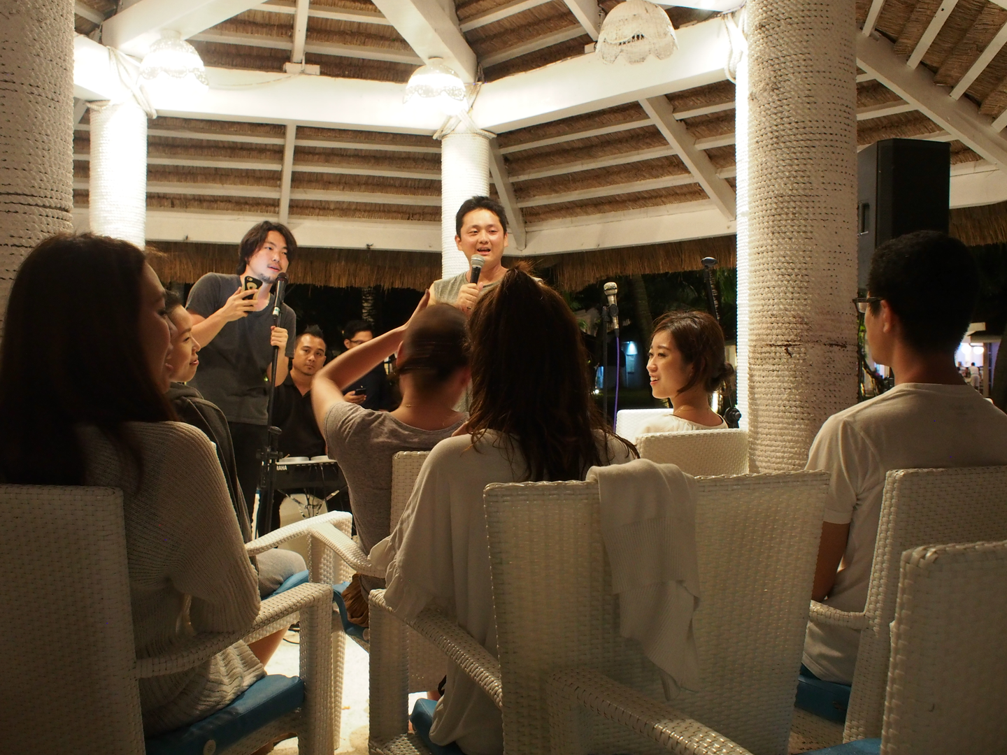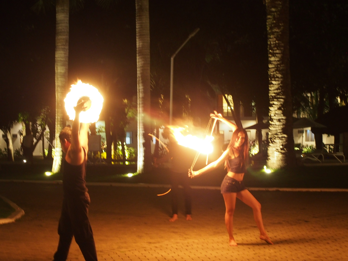 夜はホテルのビーチでパーティ。豪華に生演奏&ファイアーダンスのパフォーマンス付き!1年間がんばった甲斐がありました!