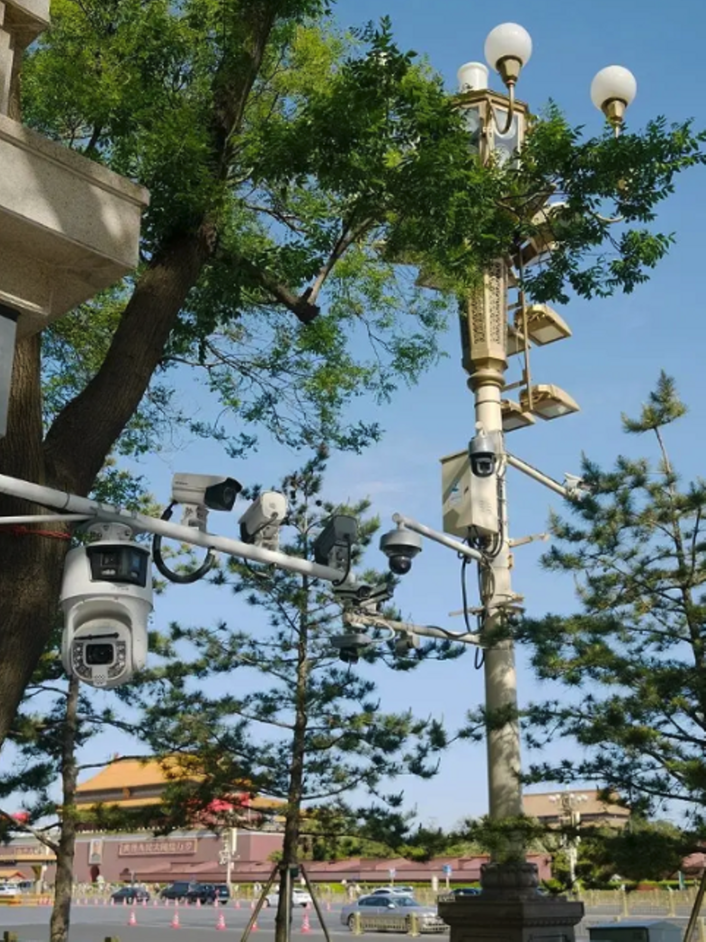 天安門広場付近の写真。街灯の柱には無数のカメラが設置