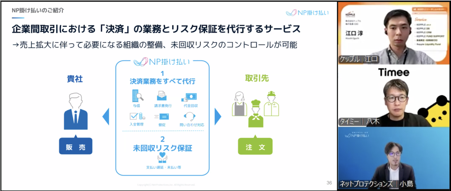NPが提供する企業間決済サービス「NP掛け払い」は、企業間取引における与信管理や請求書作成、代金回収などの業務を一括して請け負い、未回収リスクも保証するため、成長企業のバックオフィスから高い支持をいただいています。今回はスタートアップ企業のお役に立てることを事例としてお話いただき、NPにとっても貴重なセミナーとなりました。