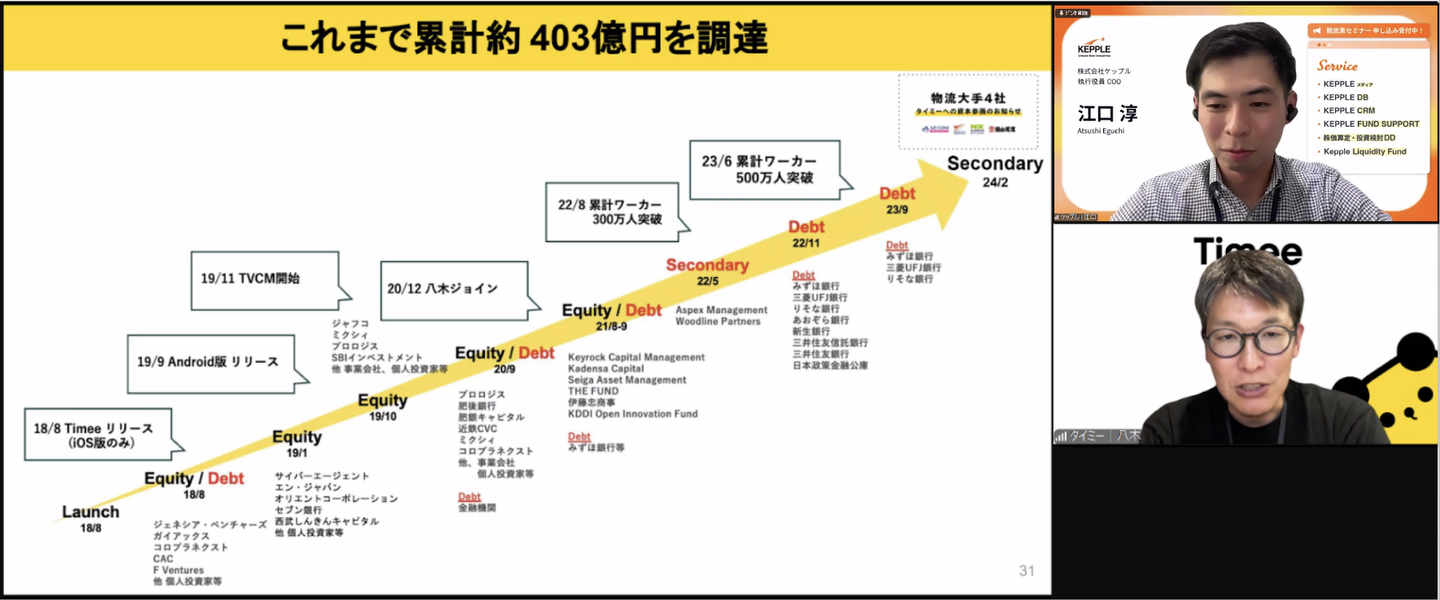 今回のセミナーは、NPの呼びかけによりスタートアップや投資家の支援を行う株式会社ケップルのモデレーションのもと、今年7月に東証グロース市場に上場した株式会社タイミーのCFO八木智昭様をスピーカーとしてお迎えし「デットファイナンスを成功させるための秘訣」をテーマに開催されました。