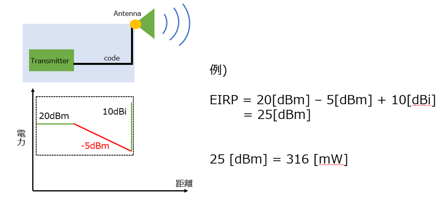 EIRP = Tx(電力) [dBm] – ケーブル損失[dBm] + アンテナ利得[dBi]